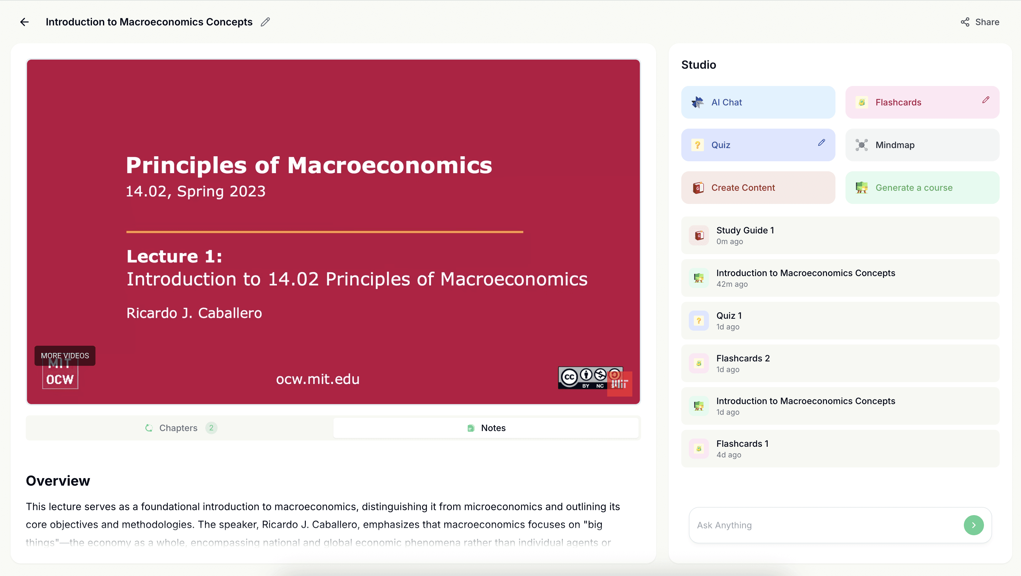 Students can upload lecture recordings, PDFs, slides, or videos and instantly generate structured study guides from those materials. The output is designed for revision, not just reading. Content is organized into sections that mirror how students actually study.
